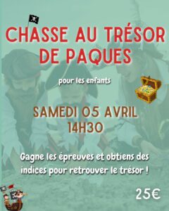- Chasse au Trésor de Pâques pour les enfants (Gagne des épreuves et obtiens des indices pour retrouver le trésor) – 14h30 – 20€ – Dès 4 ans*