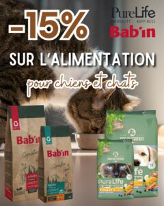 - -15% sur le rayon alimentation chiens et chats (Bab’In et PureLife) ainsi que sur tous les accessoires (sellerie, jouets, hygiène) de la marque Martin Sellier